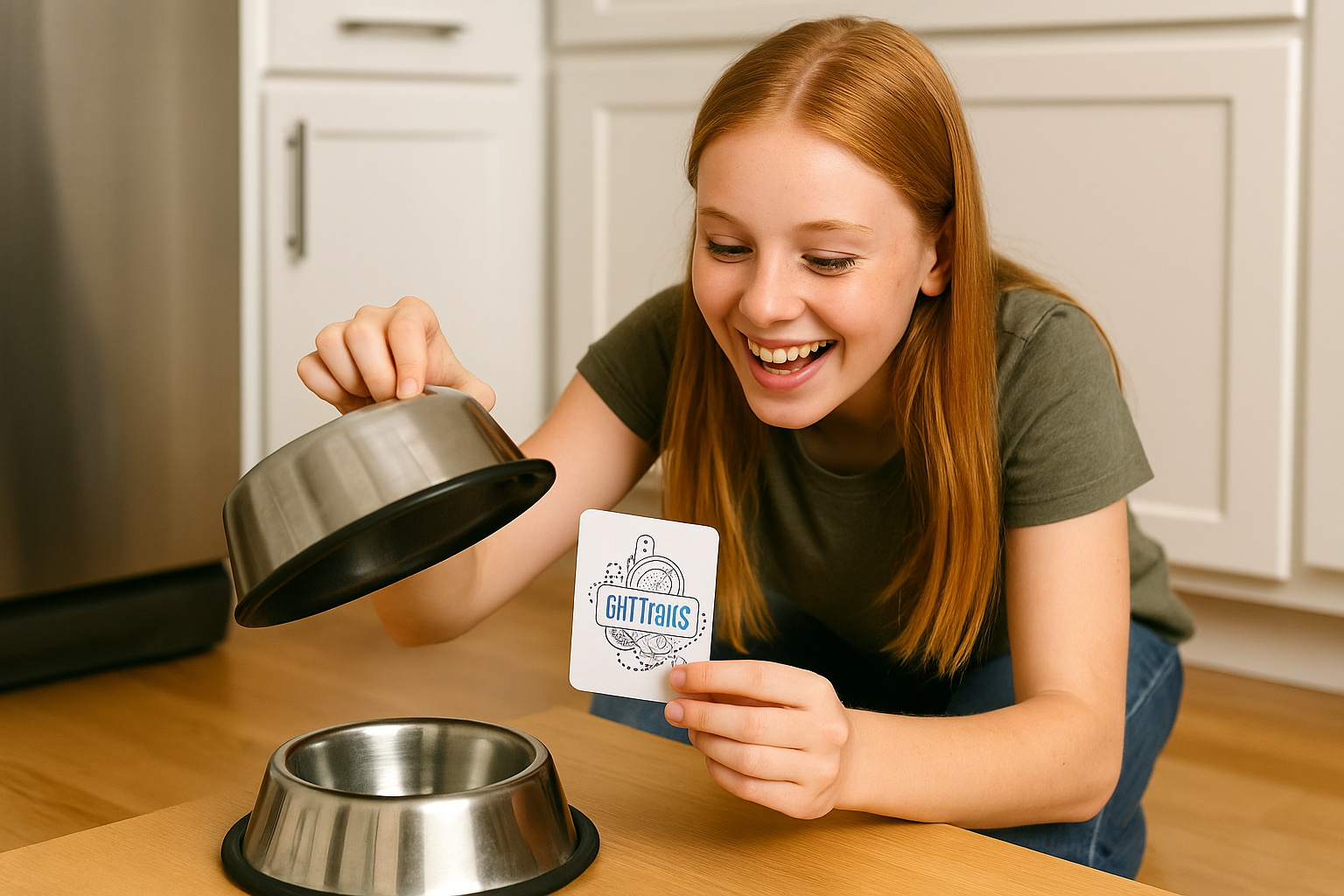 To add a puzzle to your next GiftTrails hunt, use a Challenge Card (#181–190) from your deck. Slip it into a sleeve and place it along your trail. When your hunter finds it, they’ll be sent back to the kitchen table where their puzzle will be waiting.