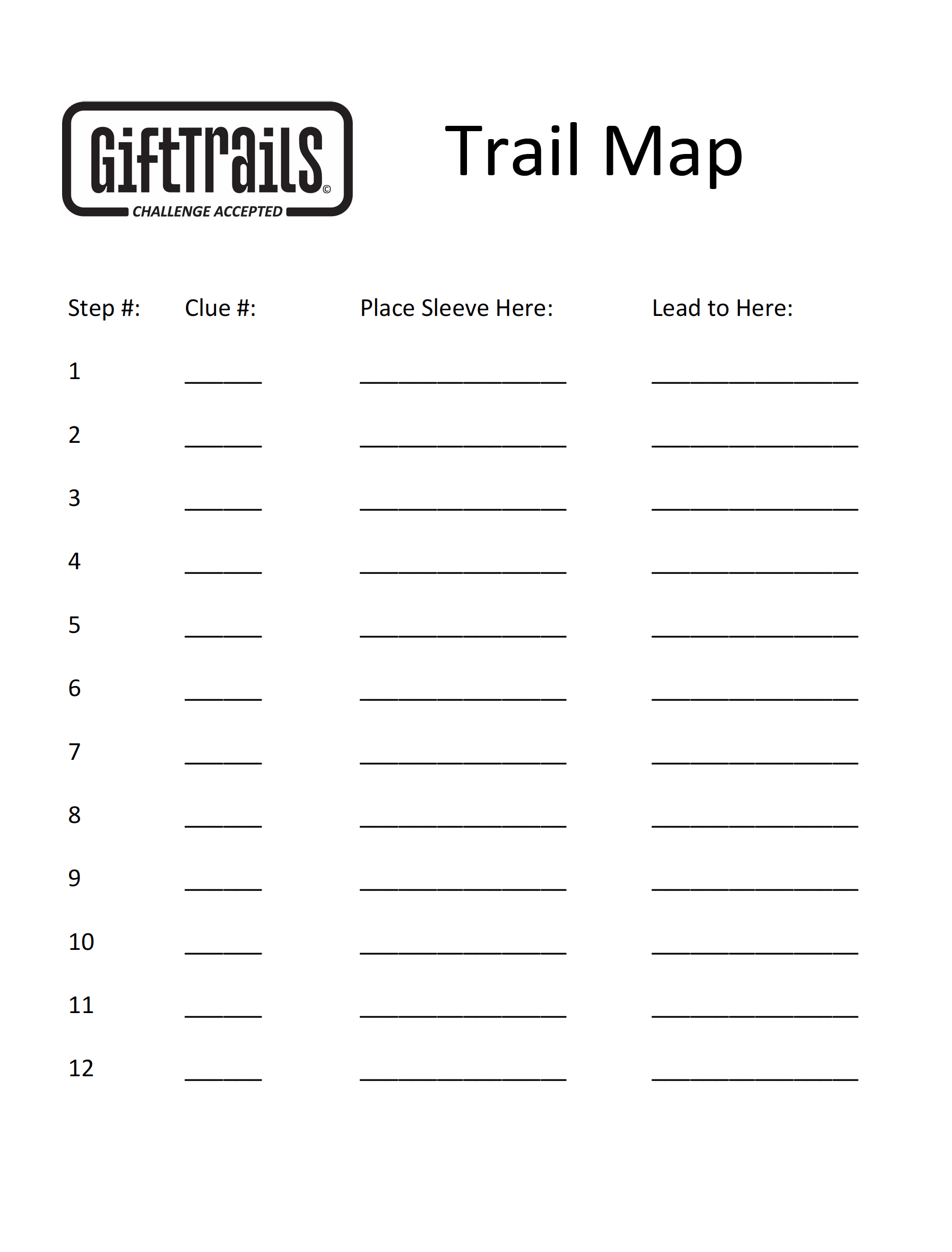 You will be thankful for this map. As you construct your trail, the map gives you both control and guidance as to where to place your clues as you set your trail up. The map will also then serve to remind you of what went where as your event unfolds! Use this map to help spread your locations out around your home.