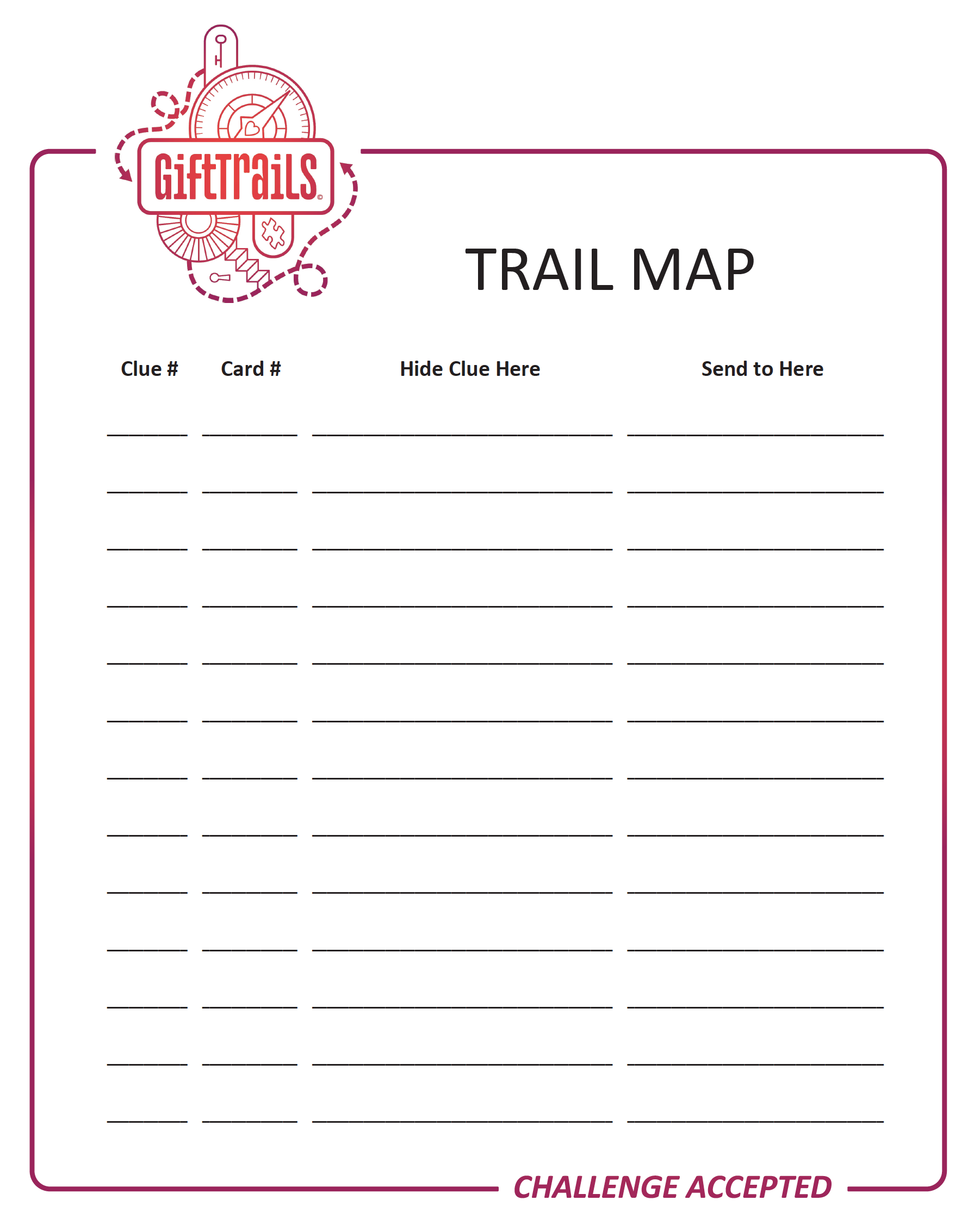 When you build your sequence, work backwards. Start with your final clue location, a space large enough to hold your gift. From there, build the rest of your lineup. Be sure to spread the rest of your clues throughout the house, but away from this final location. Avoid discovery out of order. Use your Trail Map to record your choices and remind you when planting clues.