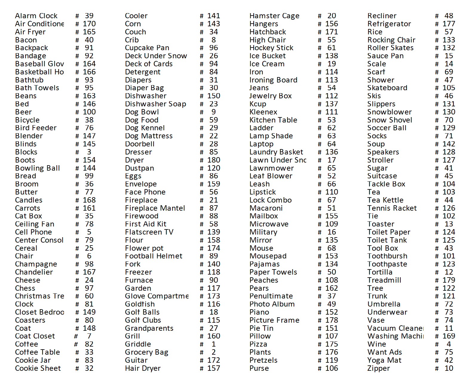 Some locations are super specific. Mailbox, Blender, Tool Box, Hockey Stick. But don’t be afraid to use more generic clues also. Lamp Shade 63, Chair 6, Coat 148, Zipper 10. The generic clues will send the kids all over your home trying to find the right one.
