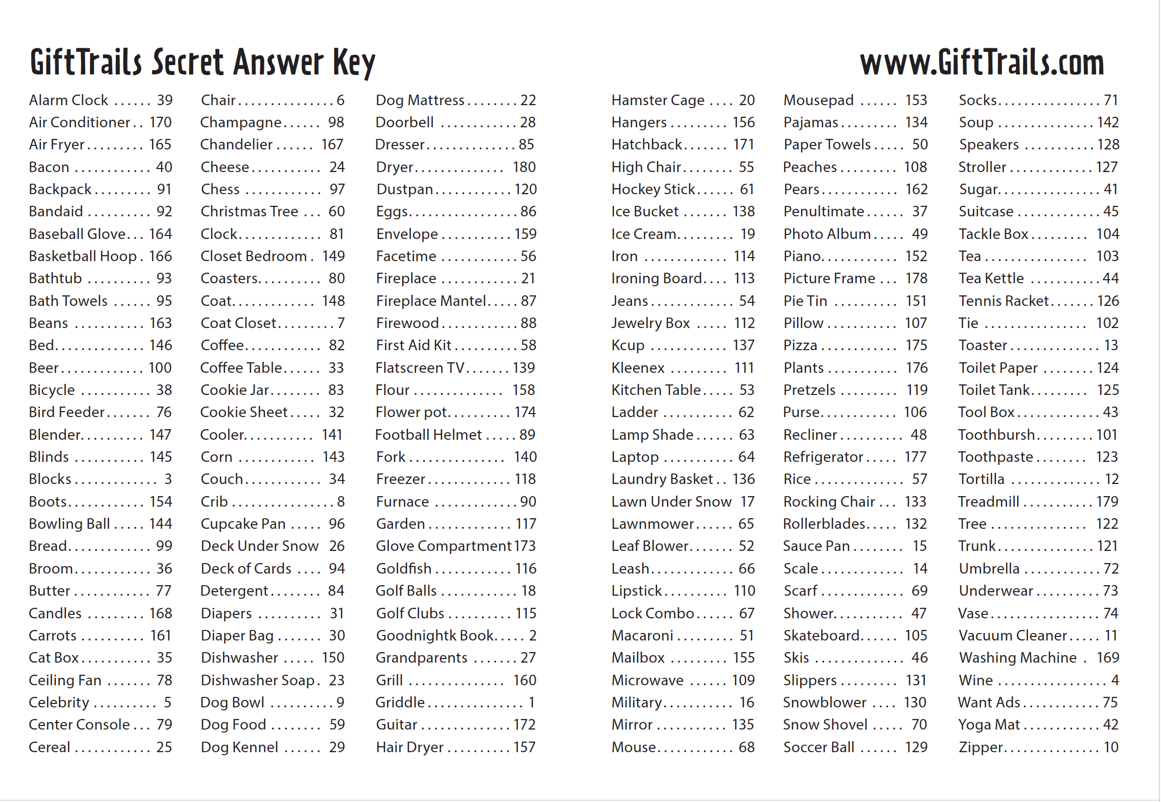 This master list is your shortcut to building a trail. With every hiding spot organized alphabetically and numbered 1–200, you can scroll through, choose your favorites, and instantly find the matching clue cards in your deck.