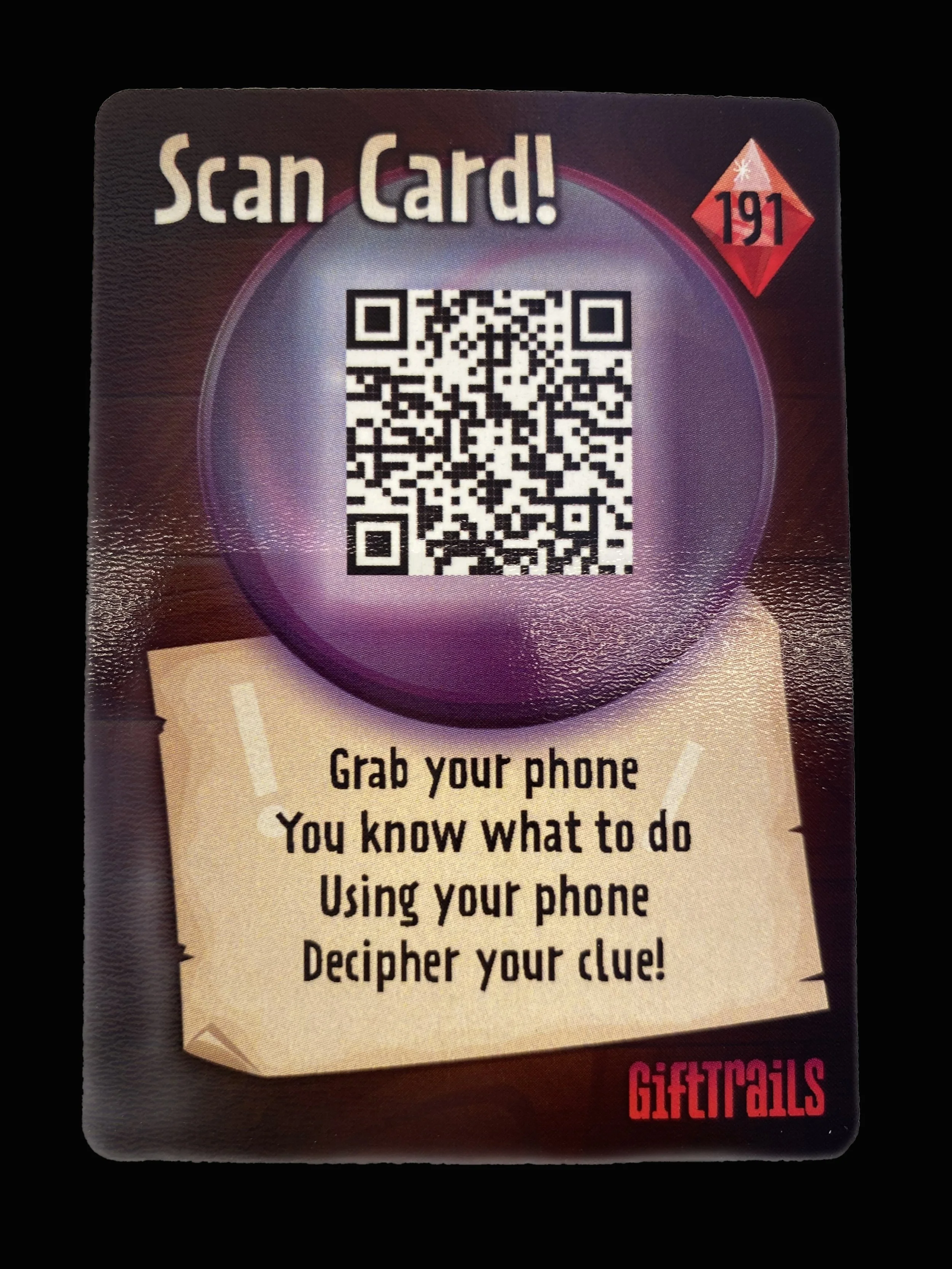 Clue Cards #191-200 are Scan Cards. Have your Hunter use their smartphone and open up the clue. These clues will be changed out over time to keep the clues fresh. Mostly Rebus puzzles, but more surprises in store!